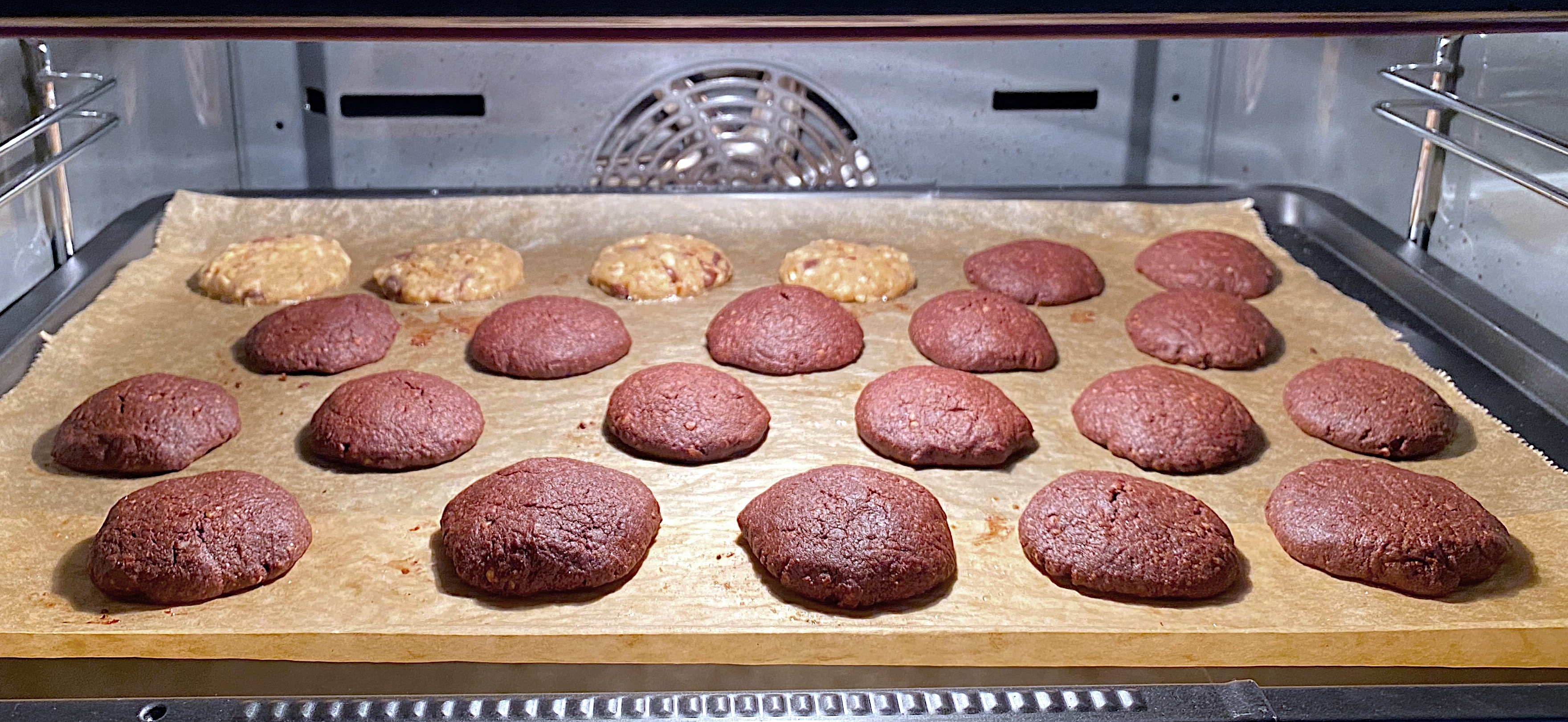 Eine Zeit lang, wollte ich auf glutenhaltige Lebensmittel möglichst verzichten und schauen, ob ich mich damit anders fühlen würde. Backen wollte ich trotzdem noch. Wie kann ich leckere Kuchen oder Kekse backen ohne das die trocken und geschmacklos werden? Eine Weile habe ich experimentiert und dann sind diese wundervollen Cookies in einer Dachgeschosswohnung mit tollem Ausblick über das grüne Leipzig dabei heraus gekommen. Ich sehe mich immer noch in dieser wunderschönen modernen Hochglanzküche stehen und zum dritten Mal über dem Rezept brüten, weil die ersten Versuche zwar geschmacklich toll waren, aber sehr krümelig und trocken geworden sind. Das Eintauchen der Kekse in Schokolade sollte diese damals etwas besser konservieren und zusammenhalten. Viele sind beim Eintauchen immer wieder kaputt gegangen und mussten sofort aufgegessen werden. Ich justierte nach, verringerte die Mengen einiger Zutaten, erhöhte dagegen andere. Eine Teigruhe war ebenfalls extrem wichtig. Jetzt sind es mit Abstand die beliebtesten Kekse von allen geworden und werden immer als erstes aufgegessen. Braunhirse verleiht ihnen einen starken Geschmack, viel Kakao, gemahlene Haselnüsse, Kokosblütenzucker, Butter, Ei, Vanille, Amaretto, Tapiokastärke, Vanillesalz, Zimt, etwas Muskat, Nelke, Koriander, kleine Bitterschokoladenperlen (sind eigentlich für Schokotrunk gedacht) und gute Bitterschokolade zum Eintauchen nach dem Backen. Dieses Jahr wurden ein paar von ihnen mit weißer Schokolade dekoriert. Das fand noch nicht so den Zuspruch. Warten wir mal ab.