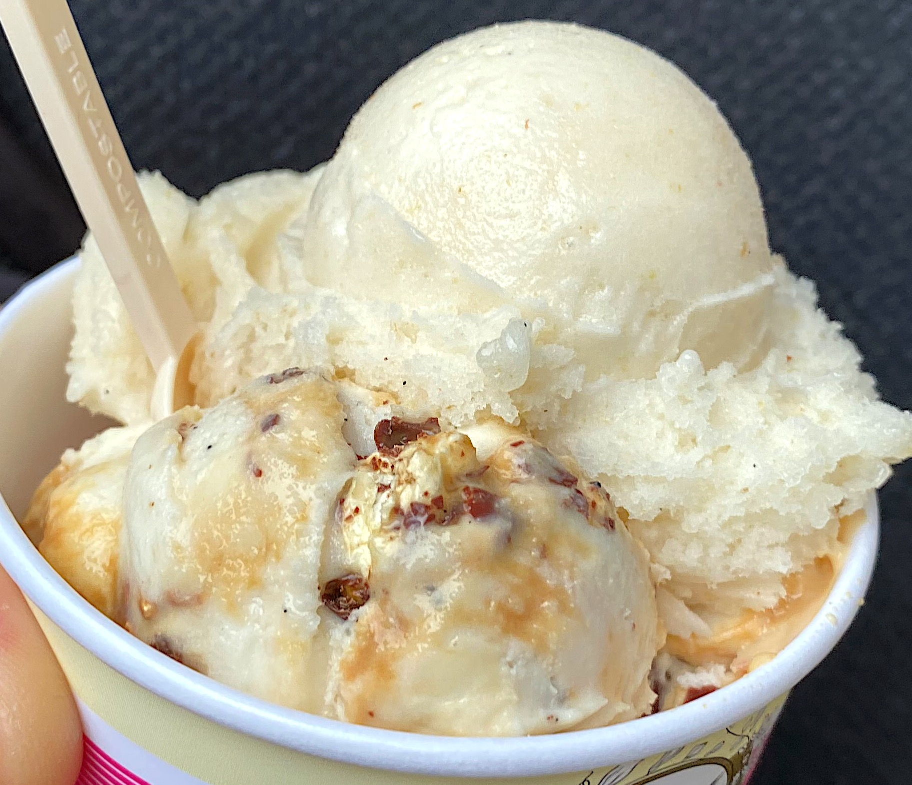 Hat mich sehr überrascht… Haselnusseis mit gerösteten und caramelisierten Haselnüssen und Schokostückchen. Die Nüsse haben eine herausragende Qualität. Sie und auch das Eis schmecken wie piemonteser Haselnüsse.