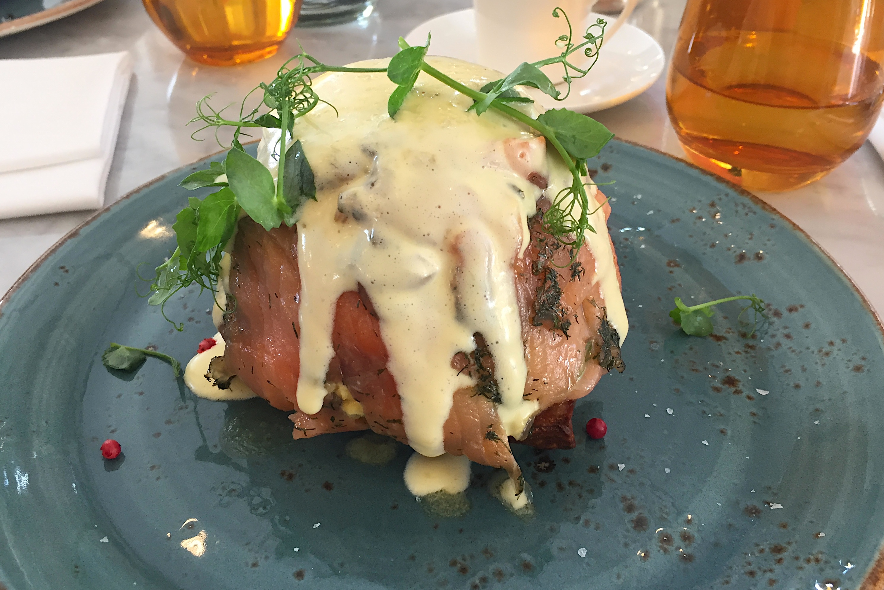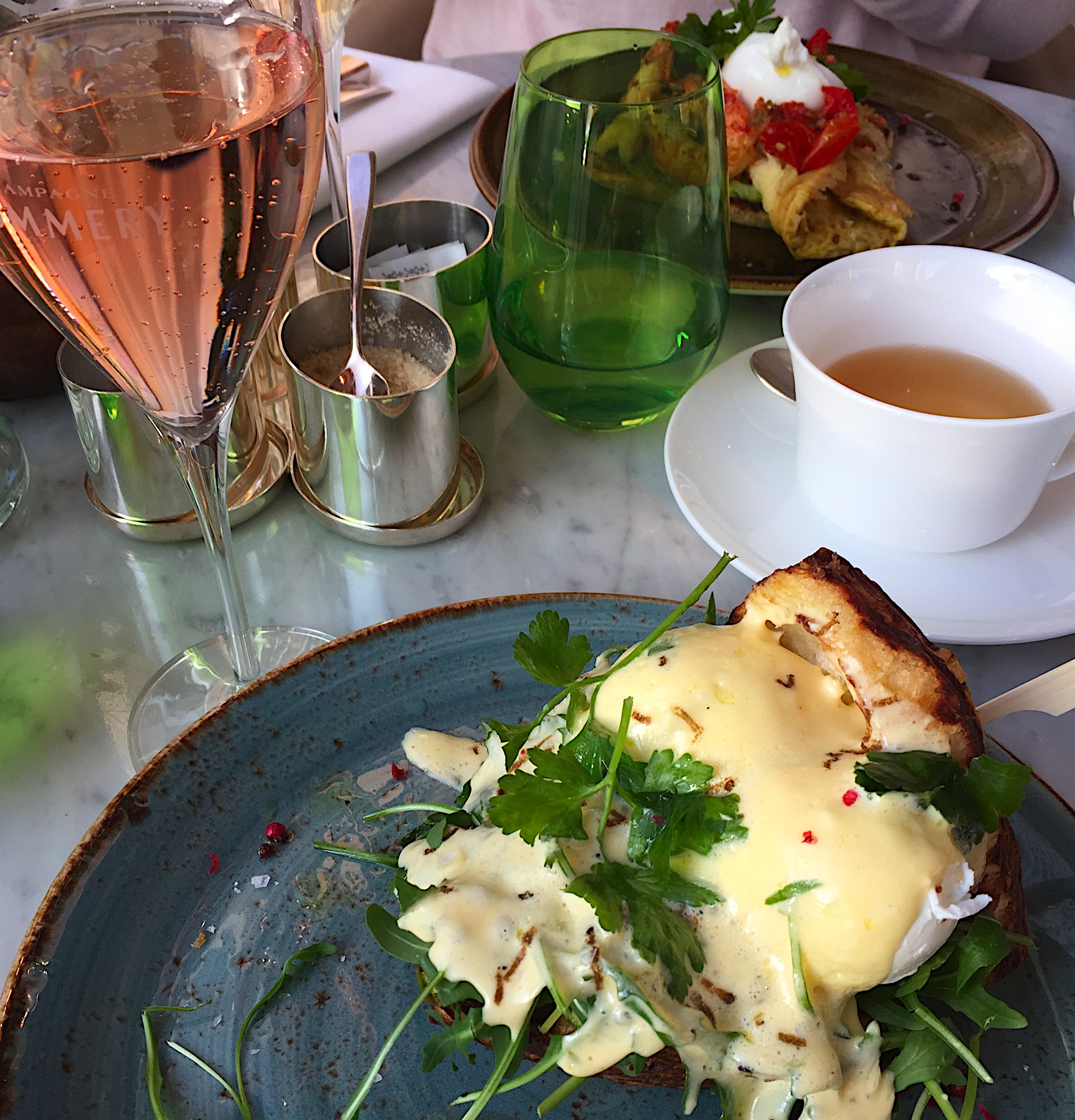 Die ausgefallenen Eierspeisen zum Frühstück sind sehr lecker, frisch sowie farbenfroh und originell. Diese Kombination von Zutaten würde ich zu Hause nie machen oder nur äußerst schwer selbst hinbekommen wie zum Beispiel Eggs Benedict: pochierte Eier auf einer Art herzhaften Croissant, mit Sauce Hollandaise, krossen Speck oder Garnele und Kräutern. Die Cafékreationen sind gut und auch die angebotenen grünen Tees sind von einer hervorragenden Qualität. Schwarzen Tee gibt es selbstverständlich auch. Achtung Ziehzeiten des Tees beachten, sonst schmeckt er bitter! Wer mag kann sich am Wochenende zwischen 11:00 Uhr und 16:00 Uhr auch das Champagner-Frühstück gönnen. Das Arrangement besteht aus einem Gericht aus der jeweiligen Kategorie Herzhaft bzw. Süß sowie einem Glas Champagner. Für einen besonderen Anlass könnte man durchaus mal schwach werden, zum Geburtstag vielleicht. Champagner am Geburtstagsmorgen vertreibt Kummer und Sorgen – so lässt sich zumindest das brutale älter werden an diesem Tag gut verkraften. Stößchen!