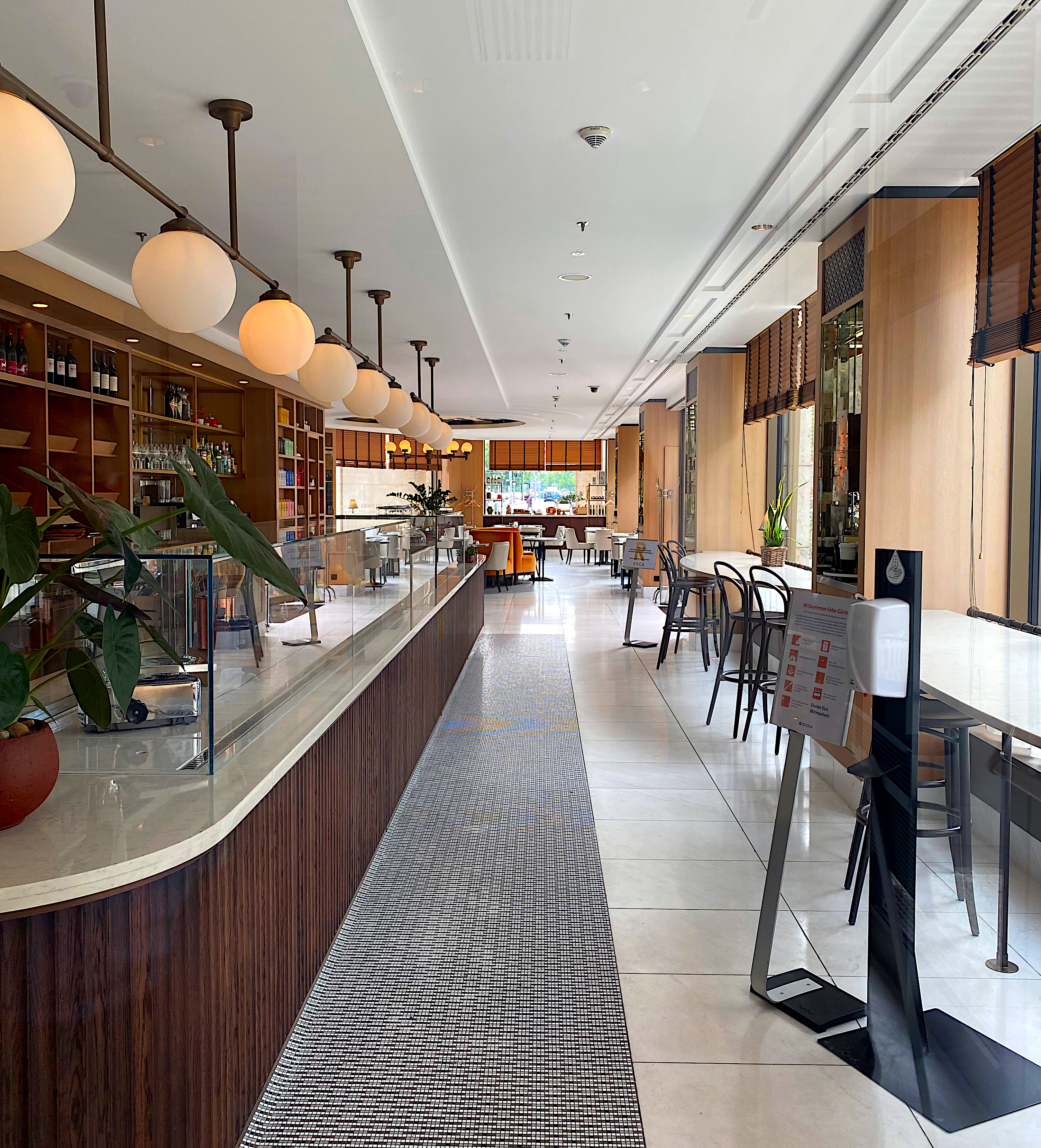 Im ROCA Restaurant geht es schön ruhig und entspannt zu. Ein Ort, wo man den Tag ganz langsam beginnen und sich in einer wunderschön gestalteten, hellen, freundlichen Umgebung zurücklehnen kann. Sanfte Farben und leise Töne lassen euch die Hektik der Stadt für einen Moment vergessen. Der Service ist angenehm, zuvorkommend und sehr kundenorientiert. So wie es sich eben für ein Hotelrestaurant gehört, denn wir befinden uns im Erdgeschoss des Waldorf Astoria. Das Restaurant selbst erreicht ihr direkt über einen Seiteneingang der sich in der Kantstraße befindet. Werft vorher gern einen Blick in die Lobby, denn diese wurde sehr eindrucksvoll ausgestattet und ist eine Augenweide. Danach geht ihr von dort hinüber ins Restaurant. Ihr kommt vorn vorbei an einer langen Theke, welche normalerweise mit allerlei leckeren Dingen gefüllt ist, die ihr bestellen oder auch mitnehmen könnt.