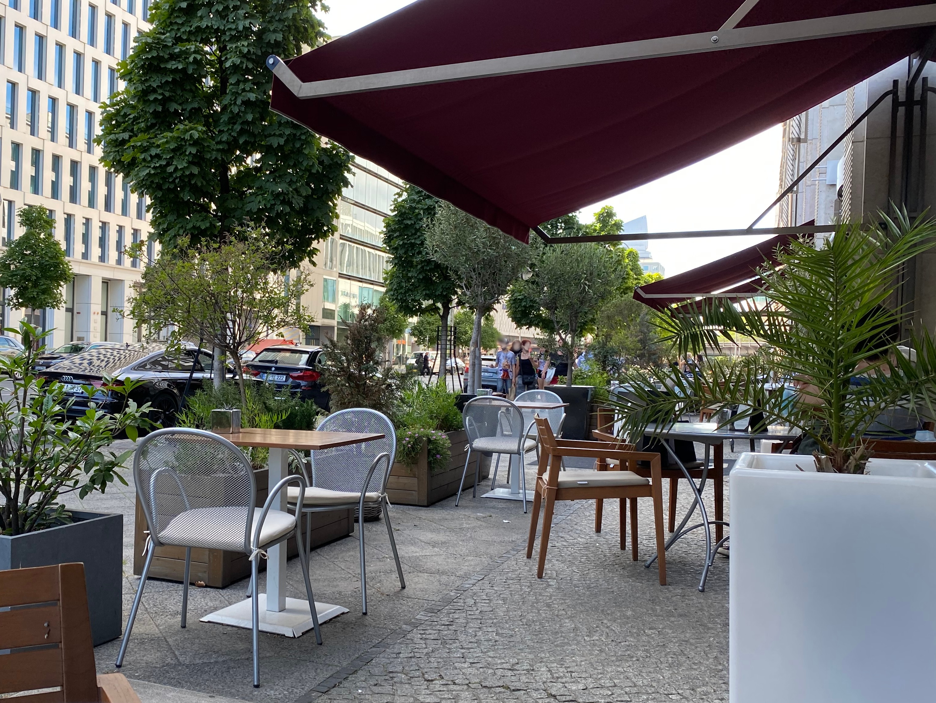 Das Restaurant hat in der schönen Jahreszeit einen hübschen Freisitz zu bieten. Große dunkelrote Markisen spenden Schatten. Eine mediterrane Bepflanzung bildet eine kleine Abgrenzung, um geschützt zu sitzen und sich wohlfühlen zu können obwohl man sich direkt neben der stark befahrenen Kantstraße befindet. Vorteil ist, dass sich hier interessante Einblicke auf das touristische Geschehen ringsherum ergeben. Für ein wirklich entspanntes Frühstück in der warmen Jahreszeit bei Sonnenschein und blauem Himmel auf dem Freisitz würde ich euch einen Sonntag ans Herz legen. Dann könnt ihr ungestört dem Glockenspiel der Kaiser-Wilhelm-Gedächtniskirche lauschen. Natürlich sitzt ihr auch drinnen wunderbar, entweder direkt an den Fensterplätzen oder auf einer der zentral angeordneten bequemen Sitzgruppen. Über den Sitzgruppen befindet sich ein Deckengemälde, welches wohl geteilte Meinungen hervorruft. Einige empfinden es ein wenig kitschig. Dazu kann ich nur sagen: es wäre sowieso unhöflich die ganze Zeit nach oben zu schauen. 🙂 Die Aufmerksamkeit sollte euer Gegenüber auf sich ziehen sowie der hübsch dekorierte Hauptraum mit fast schon dreieckig anmutenden Grundriss. Außerdem habt ihr von hier drinnen aus unter anderem einen guten Blick auf den Zoopalast, welcher eines der schönsten Kinos in Berlin und auf jeden Fall einen Besuch wert ist.